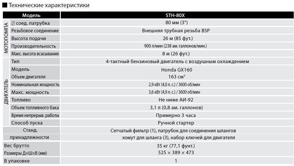Бензиновая мотопомпа, для средне-загрязненной воды (откачка дренажных колодцев, ликвидация локальных подтоплений и разливов после весенних паводков) Мощность, 4 лс, Производительность 54 куб м/час, напор 26 м, двигатель Honda GX160, D вх/вых 80 мм, размер частиц 9 мм, бак 3.1 л.