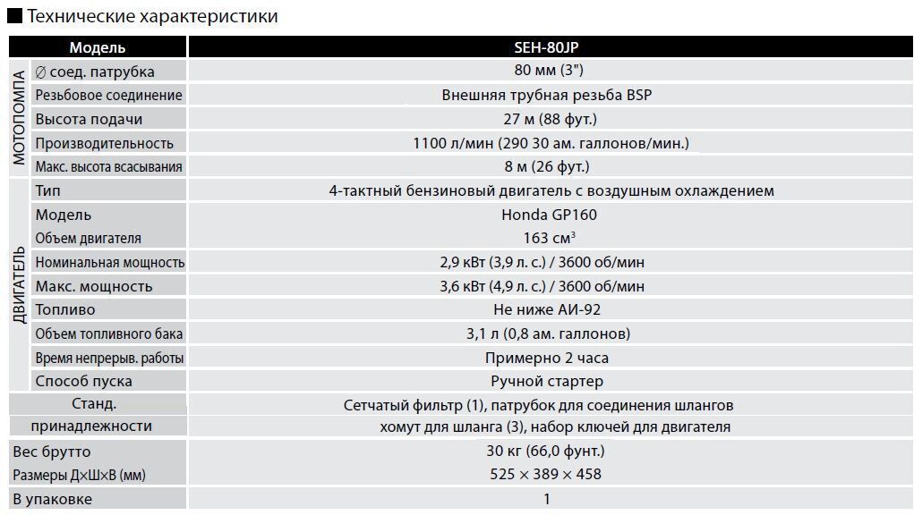 Бензиновая мотопомпа, для слабозагрязненной воды (откачка речной воды, колодца, затопленного подвала и дачного участка) Мощность, 3.9 лс, Производительность 66 куб м/час, напор 27 м, двигатель Honda GP160, D вх/вых 80 мм, размер частиц 6 мм, бак 3.1 л.