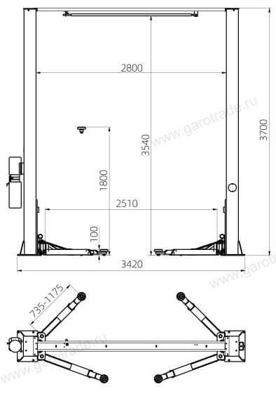 Характеристики Двухстоечный подъемник с верхней синхронизацией Габарит 3700 мм S4D-2 380 V C Темп