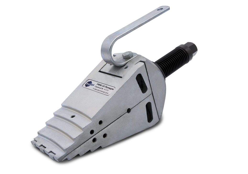 Профессиональное механическое устройство для раздвижения фланцев РФМ-14 используется при проведении профилактических и ремонтных работ на трубопроводах различного диаметра (фланцевый способ соединения). За счет закругленной формы ступеней раздвижения, повторяющих контур фланца, происходит увеличение площади контакта инструмента и фланца. Величина зазора, необходимая для установки разгонщика, составляет всего 6 мм, а максимальная ширина раздвижения 64 мм (с использованием ступенчатых опор до 92 мм). Устройство развивает усилие до 14 т, механическая конструкция обеспечивает плавность работы. Отличается высокой надёжностью и малым весом. Поверхность инструмента защищена от коррозии гальваническим покрытием.