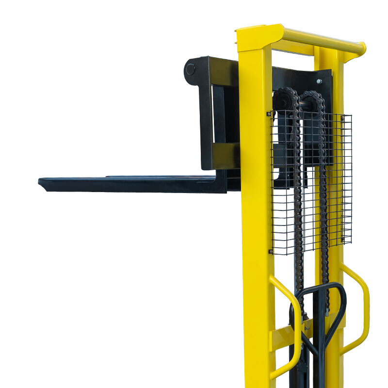 С заботой о безопасности оператора, на штабелере установлен защитный решетчатый экран. С целью повышения комфорта работы, на штабелере установлены раздвижные вилы, позволяющие работать с нестандартными поддонами и негабаритными грузами. Регулировка роликов каретки и натяжения цепей позволяет сократить износ и продлить срок эксплуатации штабелера.